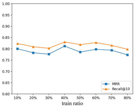 Furthermore, in order to study the robustness of our proposed model MRRNN-S, we vary the percentage of training data in the prediction task on the Wikipedia dataset. To be specific, when other parameters are fixed, the proportion of the training data is varied from 10% to 80%. In each case, the 10% interactions of the training data are used as validation, and the next 10% interactions data is used as testing. The purpose of the above experiment setting is to explore the performance under the same scale of testing data. Figure 9 shows the change in the MRR and Recall@10 on the Wikipedia dataset with the training data proportion increasing. One can see that the performance curves always fluctuate around 0.8, which means the performance of our model is stable even if the proportion of training data is changed.
