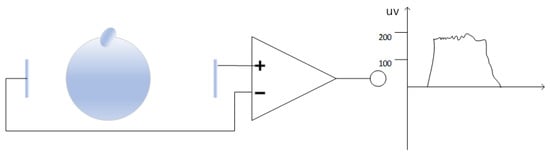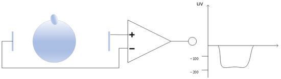 Electrooculography (EOG) is a technique that detects eye movements by measuring the electrical potential between the cornea and the retina. The eye assumes the role of the electrode between the cornea (positive electrode) and the retina (negative electrode). Any rotation of the eye in any direction causes a change in the electrical signal of the eye [10]. Previous research has established that the amplitude of the EOG signal typically varies between 50 uv and 3500 uv, with a frequency of 0–100 Hz. The amplitude of EOG and the angle of eye movement showed a similar linear trend when the eye movement direction is in the range of ±50 degrees horizontally and ±30 degrees vertically [11]. Figure 1 and Figure 2, respectively, show the schematic diagram of the change in the amplitude of EOG caused by right eye movement and left eye movement.