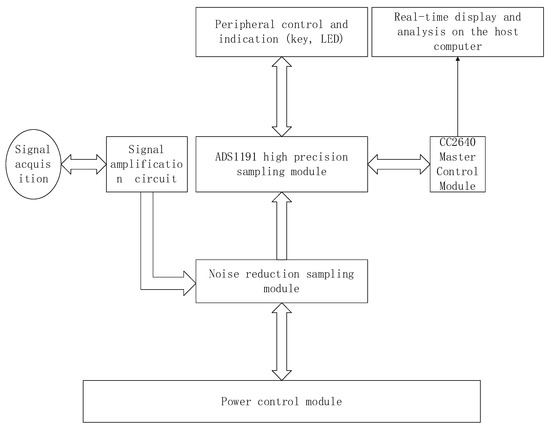 As shown in Figure 4, the system is composed of the signal acquisition module which consists of three electrodes, signal amplifying circuit, off-chip EMI filter, multiplexer, low noise amplifying module, high precision sampling circuit ADS1191 (ADS1191 is a chip with Low-Power, 2-Channel, 16-Bit Analog Front-End for biopotential measurements, produced by Texas Instruments), main control module CC2640 as the MCU for this system (CC2640 is a low power Bluetooth wireless microcontroller, produced by Texas Instruments), peripheral button, and led indicator lamp. The electrodes and the Electro Magnetic Interference (EMI) filter circuit form the front end of the EOG signal acquisition, which extracts the EOG signal and sends it to the multiplexer (MUX, integrated in ADS1191) module after it has been filtered by the EMI filter. The signal is then converted from a weak current signal into a voltage signal by an amplifier circuit, which is sampled by a high-precision sampling module at a frequency of 256 Hz and sent to the microcontroller (MCU) master control module. Additionally, the peripheral devices, such as buttons and LED indicators are used for external interaction with the system.