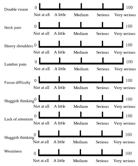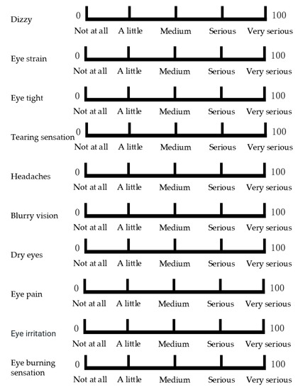 - Testing and Evaluation Method of Vision Fatigue Part 2: Scale Evaluation Method. Available online: http://www.cvianet.org.cn/download/?page=2 (accessed on 19 February 2022).