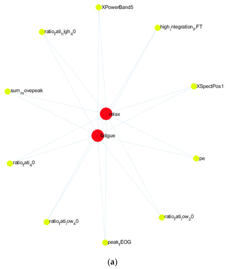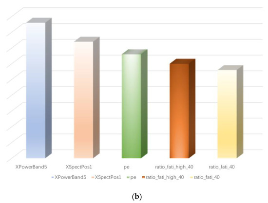 As the Figure 8b shows, the ranking of correlation between all EOG features and eye fatigue is as follows: XPowerBand5 (Energy spectrum value), XSpectPos1 (Spectrum peak value), pe (Arrange entropy values), ratio_fati_high_40 (Percentage of right eye movement amplitude), ratio_fati_40 (Percentage of eye movement), high_integration_FFT (Spectrum integration), peak_fEOG (Number of peak right eye movement points), sum_movepeak (Total number of peak points), ratio_fati_low_40 (Proportion of left eye movement_1), ratio_fati_low_20 (Proportion of left eye movement_2).