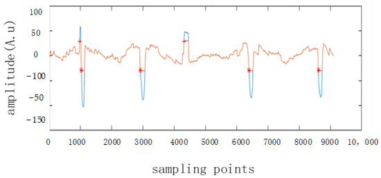 To extract the energy peak frequency feature, this paper introduces a Welch spectrum estimation method that differs from the standard periodic one. As an improved method of standard periodic spectrum estimation, the Welch spectral estimation method can reduce the noise. In the process of extracting the Welch spectrum, the signal is firstly windowed by a rectangular function. The power spectrum of the windowed signal is estimated by Welch, then the peak of the power spectrum is obtained by differential threshold algorithm. Finally, the first 6 maximum amplitude values of this peak point and their corresponding frequencies are extracted as the energy peak frequency features of this segment. As shown in Figure 10, the six values and frequencies are denoted as the red makers named Pw1, Pw2, Pw3, Pw4, Pw5, Pw6; Fw1, Fw2, Fw3, Fw4, Fw5, and Fw6, respectively.
