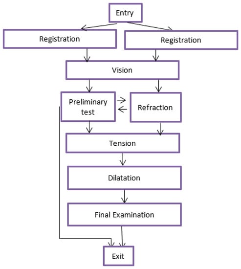 To understand the workflow, interviews were carried out with OPC staff. In addition, patient and department data were obtained from the inhouse software. To simulate the OPC workflow that depicts real-time scenario data such as patient demand, arrival times, patient in-time and patient out-time, resources in-time and out-time, and resource schedule were collected. The waiting times, cycle times, processing times and utilization were extracted from the collected data []. The Easy-Fit tool was used to determine the probability distributions of service times and patient arrival times. A bimodal Poisson distribution [,] was used to generate patient arrival times. The workflow in the OPC is as shown in Figure 1. There are two types of patients, new and review. The new patients are serviced through registration, vision, preliminary test, refraction, tension, dilatation and final examination. The processing time differs from patient to patient. Review patients follow the same clinical pathway, except the initial vision test. A few sequences in the pathway can be realigned.