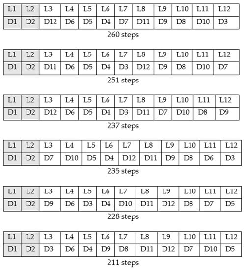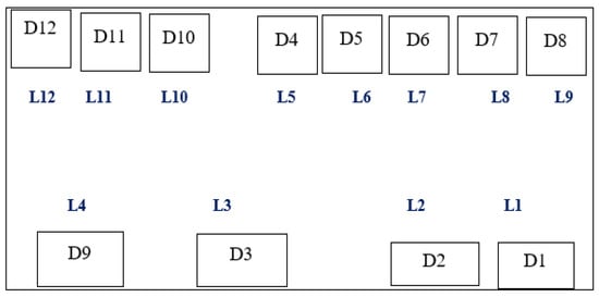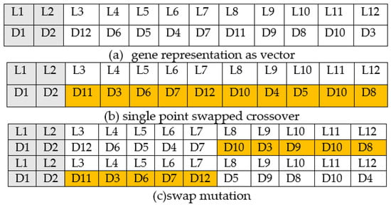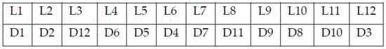 - Encoding: An encoding scheme maps feasible solutions of the problem to the strings []. Encoding should be such that the minor changes in the chromosomes (individuals) translate into minor changes in corresponding solution. In this layout optimization permutation encoding is used to represent the department order. First row indicates the room numbers and the second row indicates the departments like registration, vision, refraction etc. Together, it is called chromosome, as the entries are referred as genes and we use integers 1, 2, …, 12 (to avoid confusion they are referred as locations L1, L2, …, L12 in explanation) for departments D1—D12. New registration—D1, Review Registration—D2, Vision—D3, Refraction—D4, D5, D6, D7, D8, Tension—D9 and Preliminary test and final examination—D10, D11, D12. This is implemented as a vector and is shown in Figure 2.