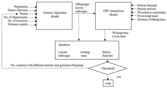It is at the operational level that the layout influences workflow management and the quality of healthcare services []. Therefore, the OPC layout should be designed carefully so that it can adapt to the future changes in the workflows. As the layout design is a strategic decision with a long-term impact, it cannot be very easily adapted to the changing scenarios because it involves high cost. It is a challenging task to design or redesign the OPC layout when it is associated with uncertainties about future patient demand and related technologies. The goal of this study is to redesign a layout of an OPC that is adaptable in future to the changing patient demand and their mixes and aide in decision making. In this study, the layout redesigns are obtained with the use of a genetic algorithm, and layouts obtained are compared based on waiting times.