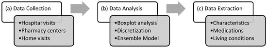 Text anomalies were manually synchronized for classification purposes. For instance, discretization was employed on “patients age” attribute in ranges instead of continuous values. Data models were analyzed to increase the likelihood of discovering intelligent data behavior, extract meaningful data facts on target attributes, and minimize the number of matching comparisons required []. In this study, three data models were used, namely “patients’ model”, “prescription model”, and “lifestyle model”. The classified data features were individually predicted as part of supervised learning [].