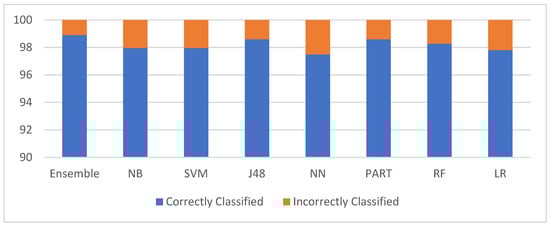 In the preceding steps, only the data in the first fold is used as input for the final meta classifier, while the data in the second fold is not used for the learning process. Therefore, an apparent weakness from the stacking method is that information in the second half that might be of great use to the weak learners is overlooked and vice versa for the first half and the meta classifier. A “k-fold cross-training” approach (such as the k-fold cross-validation approach) should be implemented to address this limitation. That way, for every observation or prediction made by the weak learners that may be used as an input to the meta-mode, the predictions and observations are made with iterations of base-level learners trained with the k-1 folds approach and does not include considered prediction. This approach ensures that a valid prediction is generated for each observation of the dataset made by the weak learners, allowing the meta-final model’s training stage to fully utilize the potential of the base-predictions model. In this research, the stacking method has been constructed with NB and J48, also with the NB implemented as the meta-classifier.