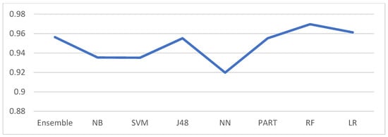 The experiments were run by introducing the ensemble stacking model against the most frequently used classifiers (Naive Bayes, J48, SVM, NN, PART, RF, and LR), which have been determined as the most popular algorithms based on the latest research [,,,,,] conducted on waterborne disease prediction and management. Computational approaches were used on the clinical data features, including testing and training. Due to the size of the data sample and to ensure that the performance estimate variations are minimal, ten cross-validations (the default) were used. As a result, 90% of the entire data was used for training, while 10% was used to store validations. In addition, parameter optimization was used to identify which methods produced the best classification results. The most optimal criteria were employed to compare the proposed ensemble model against seven classifications, including the proportion of correctly categorized instances, kappa statistics, and classification time in seconds. The ensemble model comprises of Naïve Bayes algorithm based on the conditional probabilistic model. The math behind the algorithm can be given as: