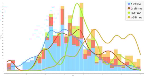 Repetition of disease among age groups for the 1st, 2nd, 3rd, and beyond.