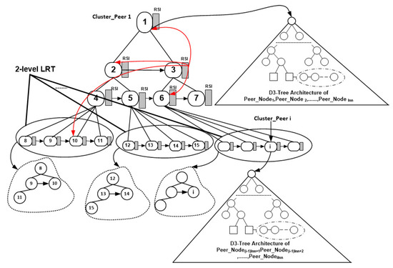 Since the structure’s maximum number of nesting levels is and at each nesting level i we have to apply the standard LRT structure in collections, the whole searching process requires hops. Then, we have to locate the target node by searching the respective decentralized structure. Through the polylogarithmic load of each cluster node, the total query complexity follows. Exploiting now the order of keys on each node, range queries require hops, where is the answer size.
