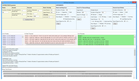 In Figure 5 we present the user interface of the -Tree simulator. At the top left, the user can construct a new tree structure after setting the tree parameters. At the top right, the user can conduct experiments regarding node joins/departures, element insertions/deletions, single and range queries, setting the parameters for each experiment. In the center of the screen, helpful information regarding the tree construction and experiments is displayed. Finally, a graphical representation of the structure is shown at the bottom.