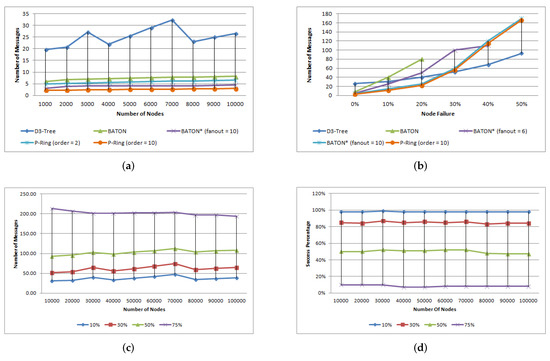 Details about the behaviour of the enhanced search mechanism of -Tree in case of node failures are depicted in Figure 8c,d, which show the average number of messages required and the success percentage, respectively.