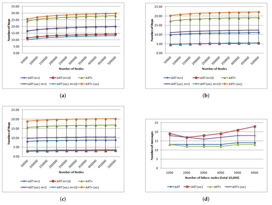 We also evaluated the performance of ART structure and compared it to its predecessor, ART [17]. Each cluster node of the ART and ART is a BATON and -Tree structure respectively. BATON was implemented and evaluated in [10], while ART was evaluated in [17], using the Distributed Java D-P2P-Sim simulator presented in [21]. The source code of the whole evaluation process, which showcases the improved performance, scalability, and robustness of ART over BATON is publicly available (http://code.google.com/p/d-p2p-sim/) (accessed on 5 December 2021). For the performance evaluation of ART, we used the -Tree simulator.