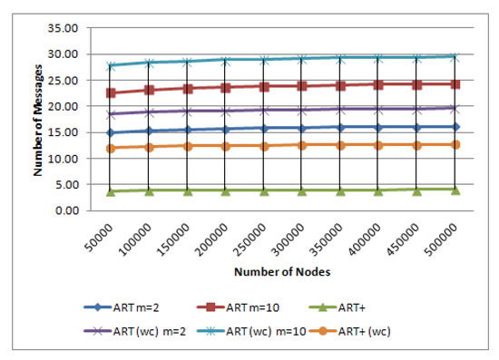 Note here that, as proved in [17], ART outperforms BATON in search operations, except for the case where . Moreover, ART achieves better load-balancing compared to BATON, since the cluster node overlay remains unaffected WHP through joins/departures of nodes, and the load-balancing performance is restricted inside a cluster node. Consequently, in this work, ART is compared directly to ART.
