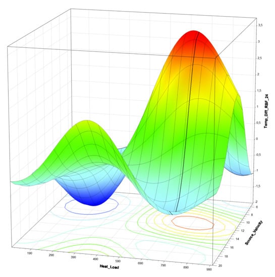 Response surface as generated in []. The surface is generated from 1000 finite element simulations, using eight input parameters. The simplified response surface has all input parameters fixed, except for the heat load and the source velocity. The fixed parameters are: = 425 mm, = 5.8 mm, = 9 mm, = 430 mm, = 48 C. Using this response surface, one can find the best temperature difference as a valley or top.