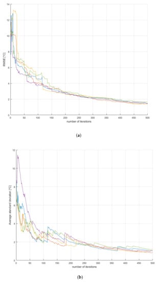 Graphical visualization of the learning process of the Gaussian process for 5 runs of 500 iterations. (a) represents the root mean square error (RMSE) of the learned surrogate compared to the response surface created in []. (b) shows the average standard deviation of the Gaussian process posterior prediction.