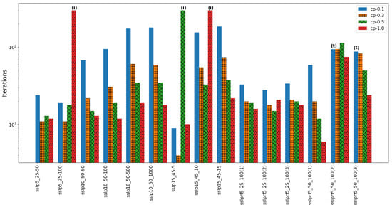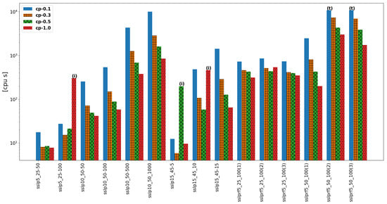 The number of iterations and the walltime for different multipliers are shown in Figure 1 and Figure 2, respectively. If the PH algorithm reaches iteration limit, there is an “(i)” label at the top of the column. If the PH algorithm reaches the time limit, there is a “(t)” label on top of the column. From Figure 1 and Figure 2, one can observe that setting the value to 0.1 makes PH take the largest number of iterations and largest amount of walltime to converge in most of the instances, which may be due to the small step size. On the other hand, setting to the largest value, i.e., 1.0, takes fewer iterations and less walltime than using other values in most instances. However, it runs out of the iteration limit in two of the instances. Overall, setting to 0.3 seems to be a robust choice because cp-0.3 always converges within a reasonable walltime and number of iterations. The details of the SSLP and SSLPR results are shown in Table A1 and Table A2 in Appendix A.