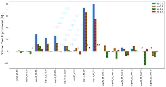 Maximum relative improvement of the solution time by using FortSP’s solvers over DECIS’s solvers.