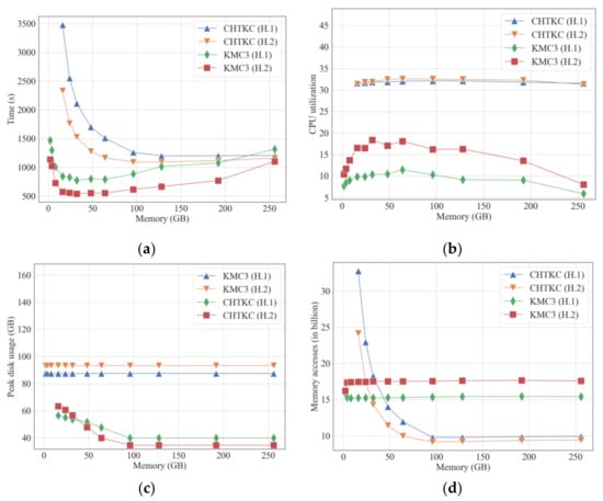Comparison of KMC3 and CHTKC with various memory limits for counting 32-mer in H.1 and H.2. (a) running time; (b) CPU utilization rate; (c) peak disk consumption; (d) memory access times.