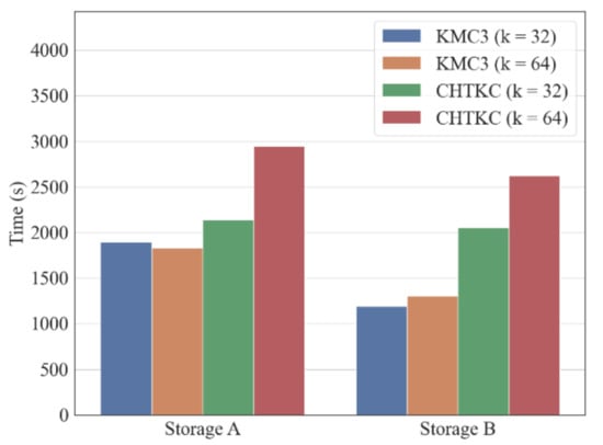 The experiment shows both KMC3 and CHTKC spend more time completing the counting task with smaller IO bandwidth (Figure 2). Among them, KMC3 is relatively more affected by IO conditions than CHTKC. For example, when the k-mer length is 32, the running time of KMC3 in storage A increases by 59% compared with storage B. Furthermore, the running time of CHTKC in storage A only increases by 4% compared with storage B. We inferred that KMC3 needs to perform data exchange between memory and disk regardless of the dataset size as a disk-based algorithm, resulting in KMC3 being IO bandwidth dependent. In contrast, the mechanism of using memory whenever possible makes CHTKC is less IO sensitive. Thus, we are convinced CHTKC as an NPBKMC performs better than PBKMC when CHTKC is running in an environment with lower IO bandwidth and more available memory.