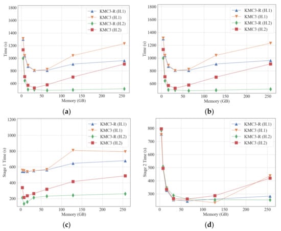 Considering that disk-based partitioning is an IO-intensive operation, and the memory mode of KMC3 can eliminate the overhead of writing and re-reading partition results, we compared the disk mode of KMC3 with the memory mode of KMC3 (Figure 3). Figure 3a shows that the KMC3-R has better overall performance than KMC3, especially when the available memory is sufficient. Combined with Figure 1c, it can infer that the disk space that KMC3 in disk mode needs to consume does not correlate with the memory size. Furthermore, we evaluated the running time of each stage. Figure 3c shows that the partition (stage 1) performance degrades with increased memory.
