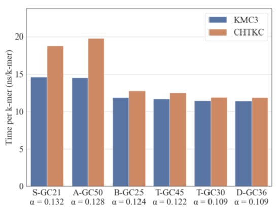 Comparison of KMC3 and CHTKC using various GC-ratio datasets. α is the ratio of the number of distinct 32-mers to total 32-mers.