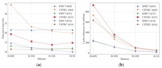 Comparison of KMC3 and CHTKC with various sequencing depth. (a) running time; (b) cache reference.