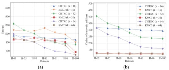 Our experiments show that for the three lengths of k-mer CHTKC is more sensitive to sequencing quality than KMC3 (Figure 6a). When the dataset has poor sequencing quality, sequencing errors dramatically increase the number of distinct k-mers. The k-mers generated by sequencing errors are low-frequency and random. For CHTKC, these k-mers can exhaust the pre-allocated hash table very soon. Afterward, the algorithm must save the following k-mers to disk, which may cause multiple batches of swaps between memory and disk, resulting in longer running time. Therefore, we can conclude that CHTKC as an NPBKMC algorithm is sensitive to the number of distinct k-mers.