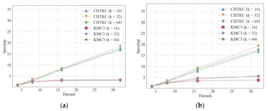 Strong scalability comparison of KMC3 and CHTKC. (a) counting k-mers with various lengths in H.1; (b) counting k-mers with various lengths in H.2.