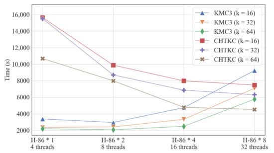 Modern computing platforms use a multi-level storage system, and the processor usually has a three-level cache system. Due to the differences in capacity and speed between storage levels, optimizing memory usage has been the focal spot of the k-mer frequency counting algorithm []. Unfortunately, bioinformaticians often need to count k-mer frequency for terabyte-scale datasets, where the capacity of RAM is generally hard to accommodate all k-mers []. Therefore, most algorithms utilize memory and disk together and compress k-mers to reduce memory and disk usage [,]. Since the differences in capacity and speed between storage levels are large, the tradeoff between memory and disk is critical to k-mer frequency counting algorithms. Our experiments show that the performance of the counting algorithms relates to the number of distinct k-mers and total k-mers in the dataset. Furthermore, many state-of-the-art algorithms are poorly scalable, and their performance decreases with the expansion of computing source or dataset volume. For example, KMC3’s speed-up enhances slowly after 16 threads.