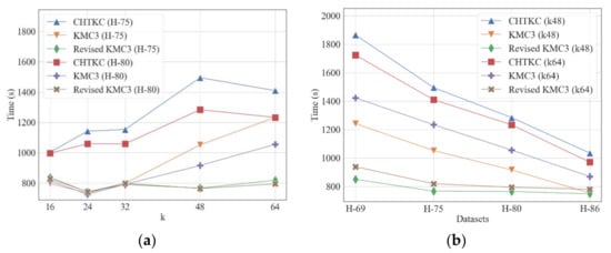 Comparison of KMC3, CHTKC, and Revised KMC3 with various sequencing errors. Memory quota: CHTKC 128 GB, KMC3 32 GB, and Revised KMC3 32 GB. (a) counting tasks with various k; (b) counting tasks in various datasets.