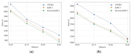 Comparison of the dumper of KMC3, CHTKC, and Revised KMC3 with various sequencing data. (a) k = 32; (b) k = 64.
