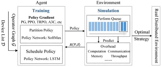 The agent in Figure 1 is the main part of reinforcement learning, which consists of double-layer policy networks: partition network and schedule network . Before the strategy search, Trinity takes computational graph and device topology diagram as input. The agent generates a model parallel strategy through a double-layer policy network. The simulator in environment computes the linear relationship between computation costs and communication costs , to simulate forward propagation, back propagation, and parameter update. The simulator computes the MDPE model according to Formula (8) by collecting performance data, for example, communication costs, computation costs, and memory occupation. Then, environment feeds the reward R back to the agent, and iteratively optimizes the policy network through the proximal policy optimization (PPO) and the above process is repeated until convergence. Finally, the strategy which can maximize the MDPE model is executed in the real distributed environment.