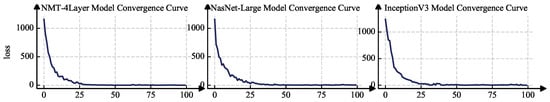 Figure 5 shows the convergence curves of the Trinity algorithm based on NMT, NASNet, and InceptionV3. We proved the convergence and effectiveness of this method. It is worth noting that, in this experiment, we used the standard Adam method to implement the gradient descent algorithm. No noise is introduced in the initial stage of training, and only the standard Adam method is used to implement the gradient descent algorithm. The total number of iterations . We recorded the loss value for each iteration. It can be seen from the curve that the algorithm continues to converge. The results show that, whether for the NLP network (NMT) or CV network (InceptionV3 and NASNet), it only takes approximately 25 rounds of iterations for the loss of the reinforcement learning search algorithm to drop to less than 10.