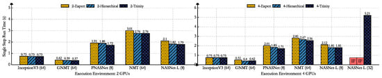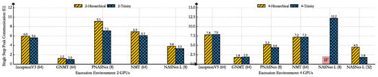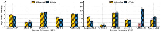 Compared with Google’s Hierarchical, the InceptionV3, and GNMT networks, the runtime of the parallel strategy searched by Trinity is similar, but it has a better performance in communication and memory. For large-scale networks, such as NASNet-L and PNASNet-L, Trinity has a better balance of performance. It is worth noting that the Hierarchical method cannot search for a suitable model parallel strategy for NASNET-L based on 4 GPU, but Trinity can. It only takes 5.21 s to execute the parallel strategy. Trinity has less runtime than layered expert methods.