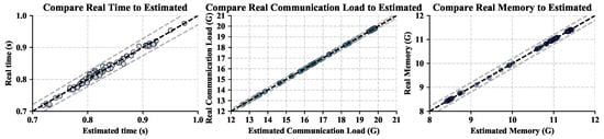 To verify the effectiveness of the simulation accuracy of the simulator for the reinforcement learning algorithm, this paper takes InceptionV3 as an example and plots the real operating performance and simulated operating performance under different strategies in Figure 9. As shown in Figure 5, the abscissa represents the simulated operating performance, and the ordinate represents the true distribution. The operating performance of the environment is measured from left to right as follows: runtime, communication load, and memory load. The left figure compares the runtime error, and the simulated error interval is approximately ±0.05 s. The middle picture compares the peak communication error, and the simulated error interval is approximately ±0.4 GB. The right picture compares the peak memory error, and the simulated error interval is approximately ±0.4 GB. The experiments prove that the simulator has a reasonable range of errors during operation, communication, and memory, which has little effect on reinforcement learning training.