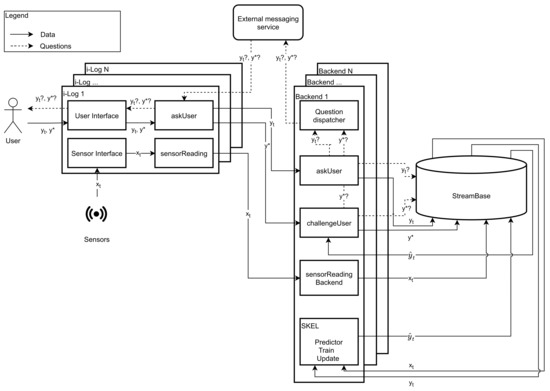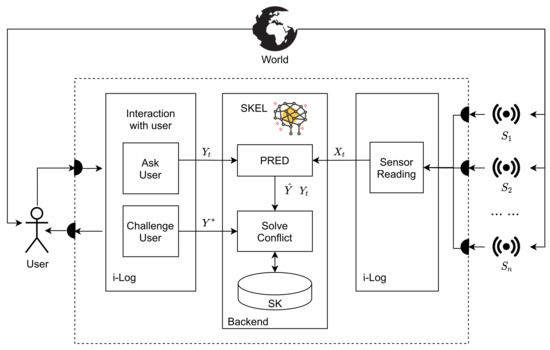 Figure 1 depicts a high-level view of the functionalities of the SkeL main algorithm, as presented in Algorithm 1. On the right side, a set of n sensors sense the world and produce a set of streams , where is the value collected by the sensor at time t. The function sensorReading generates , which represents the set of all of the sensor data streams at time t. On the left side, the user is asked to provide a label as his/her annotation to a certain property at time t. The function askUser generates the stream of labels . All these functionalities are implemented as an APP, called i-Log [11], which can be downloaded from the PlayStore. The sensor data and user’s labels are used to train a machine learning predictor PRED. PRED consists of a repertoire of m learning algorithms , each taking a stream of data as an input and producing a score for the labels, which are possible values of a certain property . Similarly to the user, PRED provides its internally predicted labels .