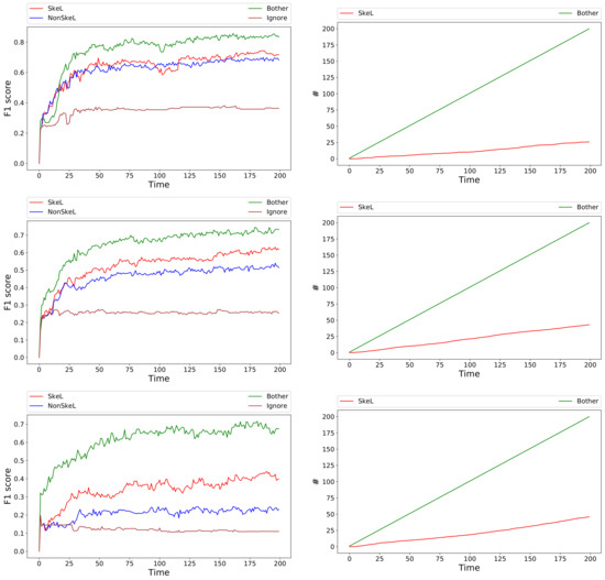 The first row represents the results of the users with fewer labeling errors. Given that these users tend to provide high-quality labels, SkeL is only slightly better than NonSkeL. This is consistent with the score in the first row of Figure 4, where the red curve and blue curve are close to each other. However, SkeL manages to substantially improve the recognition ability for On the move and Other location, the classes for which the user feedback is least frequent, at the cost of a (smaller) decrease in accuracy for the most popular ones, University and Home. This behavior is even more evident when considering users with a higher fraction of errors (middle row, from 10% to 25% labeling errors), where the fraction of times On the move and Other location get predicted and the prediction is correct increases from 2.64% to 10.96% and from 1.52% to 5.69%, respectively. The third row reports results for the least reliable users, with more than 25% labeling errors. While the distance to the “ideal” (for the machine) setting represented by Bother increases, the advantage of SkeL over NonSkeL (and Ignore) also widens. The tendency of the user to always reply with Home and University does affect SkeL, which starts to show a similar behavior (dark columns in the matrix). On the other hand, despite the substantial unreliability of the user feedback, it still manages to recover a large fraction of the On the Move (from 6.63% to 14.70%) and the Other location (from 0.62% to 8.28%) classes, both virtually lost by NonSkeL.