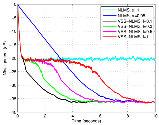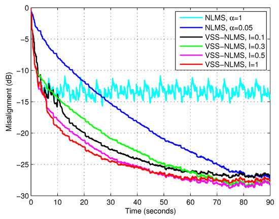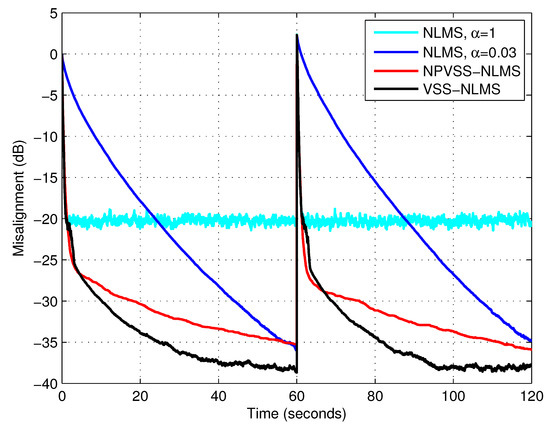 Since the conventional NLMS algorithm uses a constant step size parameter to control its performances, a compromise should be made when choosing this value. It is known that a large value implies a fast convergence rate and tracking, while a small value leads to low misadjustment and good robustness features. Since in AEC, there is a need for all these performance criteria, the step size should be controlled; therefore, a VSS version represents a more reliable choice. In addition, for real-world AEC applications, it is highly desirable to use nonparametric algorithms, in the sense that no information about the acoustic environment is required. Nevertheless, we should note that the applications of the VSS-NLMS algorithms are not limited only to the framework of AEC. Different other application areas can be explored in the field of communication systems, such as the carrier phase recovery, e.g., see [26,27] and the references therein.