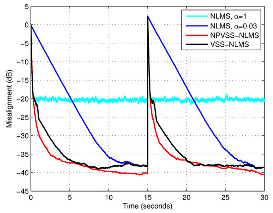 and was evaluated similar to (14). Furthermore, a very small positive constant should be added to the denominator of , in order to avoid any potential division by zero related to the estimation of . It should be outlined that the NPVSS-NLMS algorithm is usually considered as a benchmark (for many VSS-NLMS algorithms), due to its good performance and practical features. In the following experiments, the proposed VSS-NLMS algorithm uses the lower bound value . In order to test the tracking capabilities of the algorithms, an echo path change scenario was considered. All three types of input signals were used, i.e., white Gaussian noise, the AR(1) process, and speech; the results are provided in Figure 7, Figure 8 and Figure 9, respectively. It can be noticed that the NPVSS-NLMS algorithm outperformed the proposed VSS-NLMS algorithm in the case of the white Gaussian input. However, the proposed algorithm performed better for the AR(1) process and speech inputs.