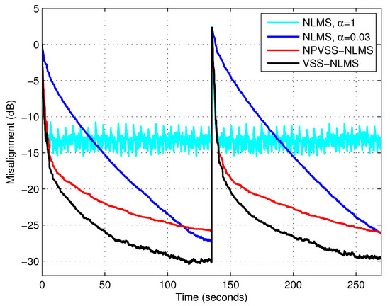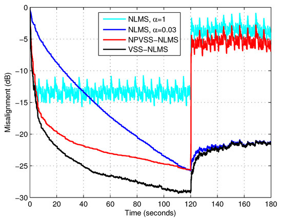 Finally, a variation of the ENR was considered, in order to assess the robustness of the algorithms. In Figure 10, the ENR decreased from 20 dB to 10 dB after 120 s. In this experiment, the input signal was speech. Here, we considered that the initial value of was available for the NPVSS-NLMS algorithm, but not the new one (i.e., after the decrease of the ENR). As expected, the proposed VSS-NLMS algorithm reacted similar to the NLMS algorithm with the smaller normalized step size, outperforming the NPVSS-NLMS algorithm.