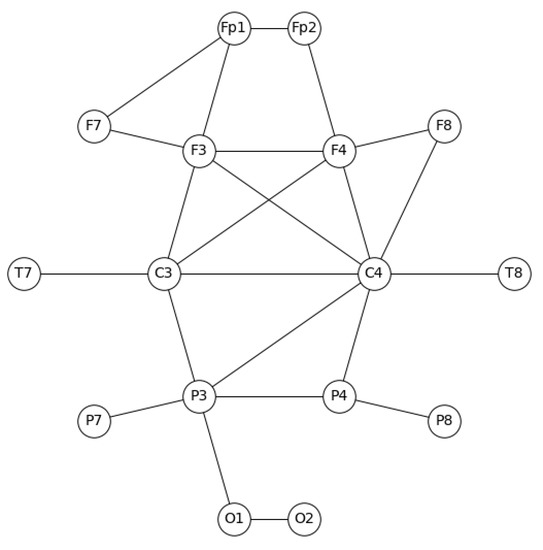 The constructed graph is undirected. The adjacency matrix () is symmetric and the maximal number of total edges in each graph (i.e., in each epoch) is therefore 120 (, where n is the number of nodes). Each node in the graph (e.g., each electrode) can have a maximum of 15 edges excluding self-loops. Self-loops were excluded since the coherence of a signal with itself is always 1. Figure 3 presents the graph obtained for an exemplar player in a specific coordination task. For example, let us consider the Fp1 electrode in a single coordination epoch. Fp1 had an absolute coherence value with Fp2, F3 and F7. Hence, the nodes representing these electrodes are connected to the Fp1 node.