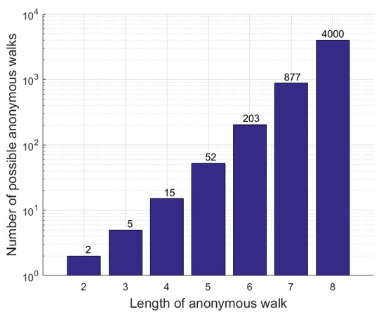 The number of anonymous walks increases exponentially as a function of the anonymous walk length, as presented in Figure 4. The minimal number of random walks needed to achieve a reliable distribution is calculated using Equation (3) (e.g., [37]):
