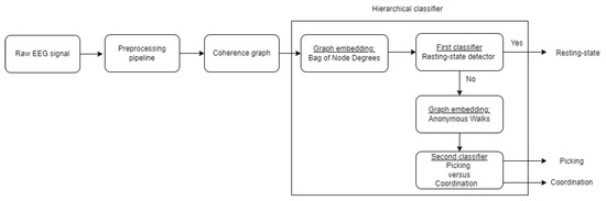 In this section, we describe the construction of a multi-class hierarchical classifier [40,41] composed of the two binary classifiers described earlier in Section 3.2 and Section 3.3 (see Figure 5). The classifier pipeline is composed of the following stages. First, following signal preprocessing, the EEG signal is transformed into a coherence graph and undergoes a process of embedding using bag of node degrees to classify it as either a non-task- or task-related process. The signals identified as task-related will then undergo an embedding process based on anonymous random walks and will be transferred to the second classification stage to evaluate the associated cognitive state (picking or coordination).