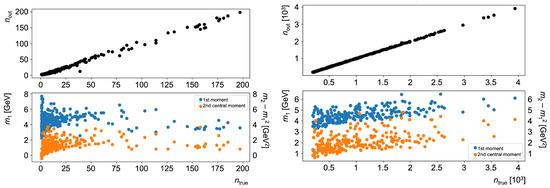 CNN outputs of the multiplicity and the first and second central moments for each event. The events are ordered according to the true (MC) number of positrons . The left and right frames refer to the smaller (<200) and larger (≥200) multiplicities. The predictions of the CNN agree with the values of the MC data. These results are used to evaluate the average moments of the energy distributions displayed in Table 2.