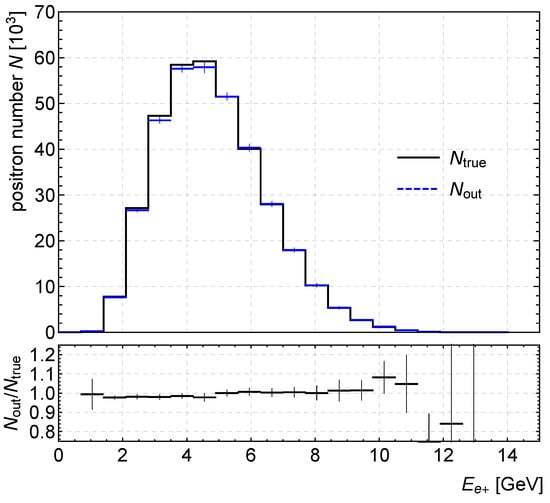 The CNN predictions have a small average bias over all bins and its root-mean-square is , where . The average number of positrons per event in these 10 runs was for the training and for the test data.