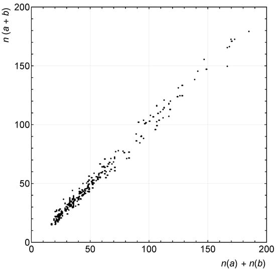 We use the predictability of n as a connection between the CNN representation and the proximity and order properties of integers, in order to establish an intuitive answer. In particular, a question of compositionality is presented: given two detector images, a and b, will their superposition in the CNN detector-image input lead to ? To perform this test, we train the CNN in the regular fashion, and apply it to a test set which is generalized to include such combinations. The superposition of two images is defined as the sum of all their detector readings, and may be evaluated by the CNN that was trained to predict n of single images. We tested this question using the µm data. Intermediate n values of show that approximate compositionality holds. The results are displayed in Figure 5. The points in these plots correspond to non-recurrent choices of pairs, for which the network estimation is plotted vs. the known sum of . Although the order of events does not adhere to a strict chain of integers, these data hint that the detector-network system is not very far from it in the shown range of n values.