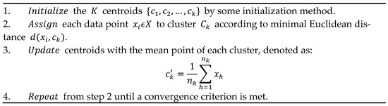 - MacQueen, J. Some methods for classification and analysis of multivariate observations. In Proceedings of the 5th Berkeley Symposium on Mathematical Statistics and Probability, Berkeley, CA, USA, 21 June–18 July 1965 and 27 December 1965–7 January 1966; University of California Press: Berkeley, CA, USA, 1967; pp. 281–297. [Google Scholar]