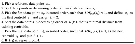 A notable example of an initialization method which is robust to outliers and addresses all the above-mentioned tree points, is ROBIN (ROBust INitialization) [3,16], which can be turned to behave deterministically. ROBIN is based on the Local Outlier Factor (), originally introduced by Breunig et al. in [19] which can be assigned to points of the dataset. takes into account a density notion around a given point and among close points and permits to filter out outliers during the centroid initialization. The modus operandi of ROBIN is summarised in Figure 2, whereas the formal definition of is shown in Figure 3.