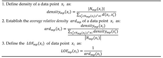 - Breunig, M.M.; Kriegel, H.-P.; Ng, R.T.; Sander, J. LOF: Identifying Density-Based Local Outliers. In Proceedings of the 2000 ACM SIGMOD International Conference on Management of Data, Dallas, TX, USA, 16–18 May 2000. [Google Scholar]